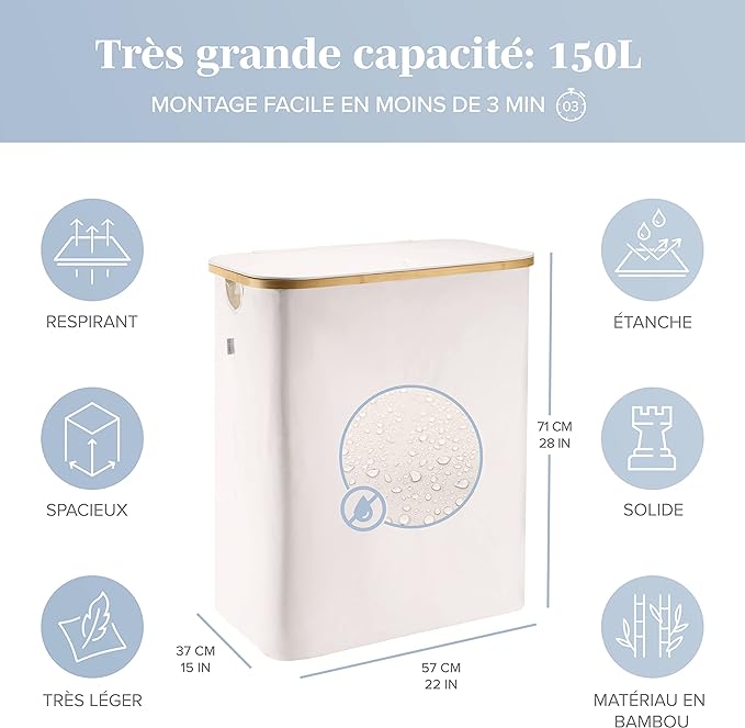 Cette corbeille à linge 150 litres beige est conçue avec des matériaux de qualité qui assure une excellente respirabilité. De plus, elle possède la capacité de filtrer les odeurs. Par ailleurs, les parties en bois du panier, dotées d’un couvercle, sont fabriquées en bambou antibactérien. Son allure élégante lui permet de s’intégrer harmonieusement dans n’importe quelle pièce. Disponible en plusieurs couleurs différentes, il s’adapte à votre style personnel. Notamment, le panier à linge noir est une option appréciée par les clients, bénéficiant de retours positifs.
