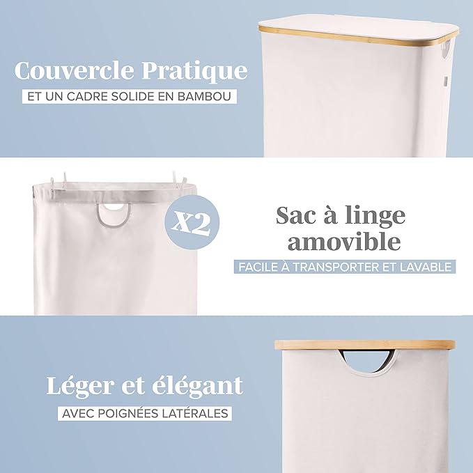 Le panier à linge 150 litres offre une solution spacieuse pour organiser efficacement votre linge. Avec des dimensions de 57x37x71 cm, ce panier peut accueillir l’ensemble de vos vêtements sales. En outre, cela permet d’éviter ainsi les tracas liés à l’accumulation de linge. Vous trouverez par la suite deux grands sacs intérieurs qui facilitent le tri du linge. Cela permet de garantir la séparation des vêtements blancs pour éviter les taches inattendues.