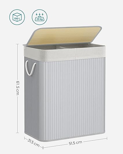 Les dimensions de ce coffre à linge à compartiments sont de 51,5 x 31,5 x 60,5 cm. En effet, il offre une contenance de 100 litres. Cette grande capacité permet donc de stocker facilement une grosse quantité de linge.